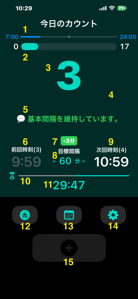 - カウントダウンバー:カウントボタンを押すとスタートします。これは「目標間隔」の時間の長さであり、「前回時刻」→「次回時刻」までの残り時間を視覚的に表現しています。