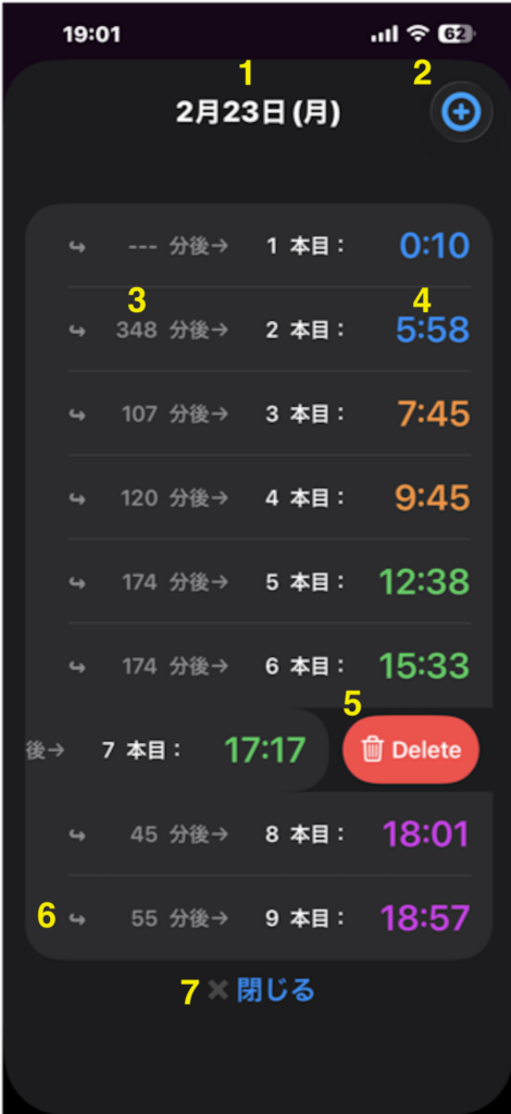 具体的には、「ペースバッジ」に注目し、表示している「-○分」を「+○分」に付合を置き換え、表示している「次回時刻」に足してみましょう。