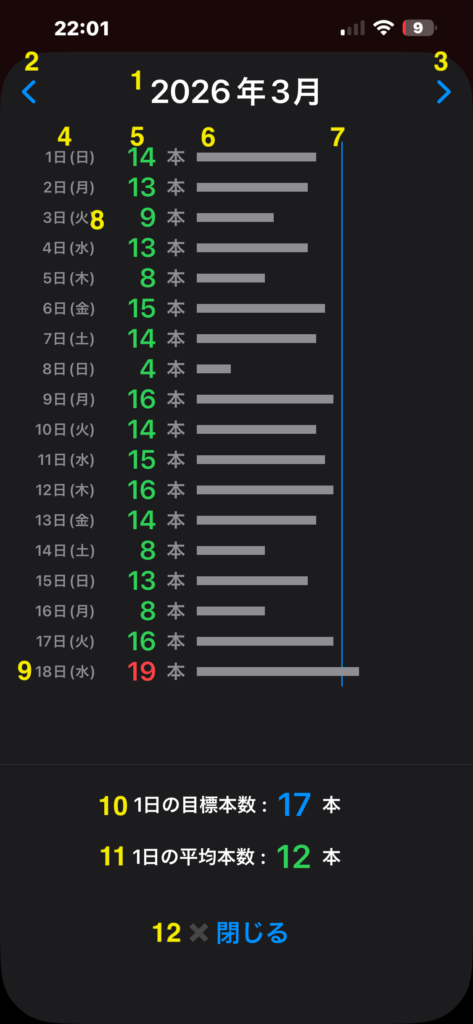- 目標本数バー:本数グラフの位置に対応するように、上限本数の位置に青い縦ラインを引いています。