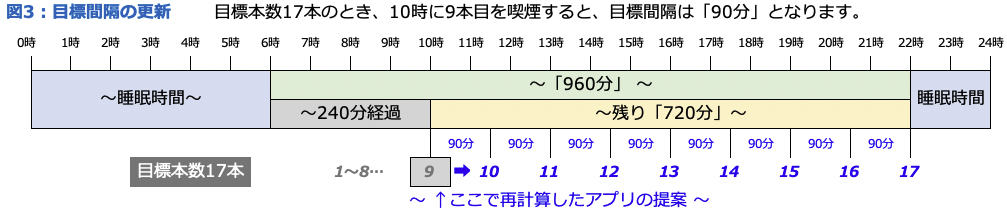 今の時刻(前回時刻)からカウント終了時刻までの「残り時間」を、今日の「残り本数(目標本数 - 喫煙カウント)」で等分して算出しています。