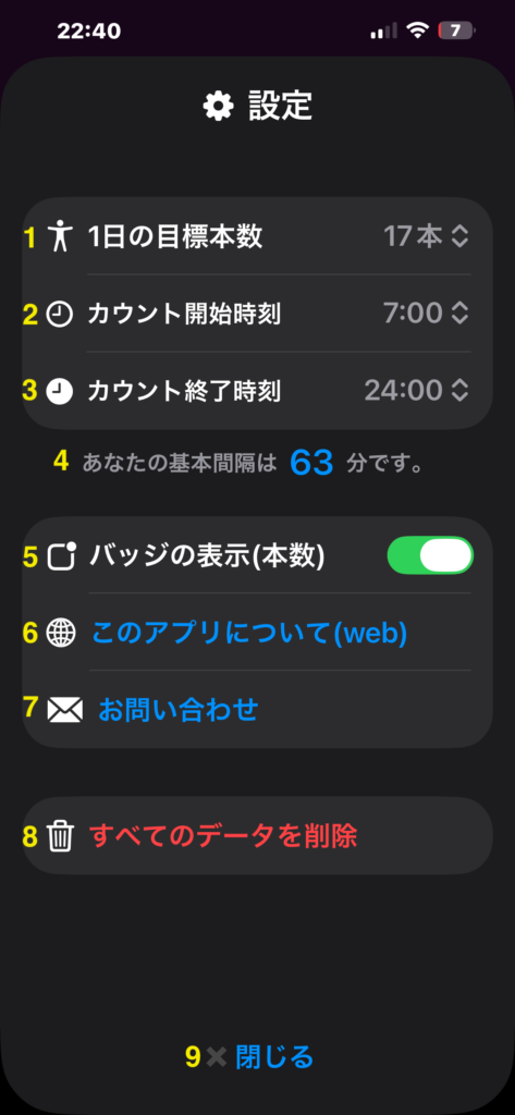 「目標間隔」とは、カウントボタンを押した時点でアプリが再計算する「次の喫煙まで、これだけの時間を空けましょう」という提案時間(分)です。